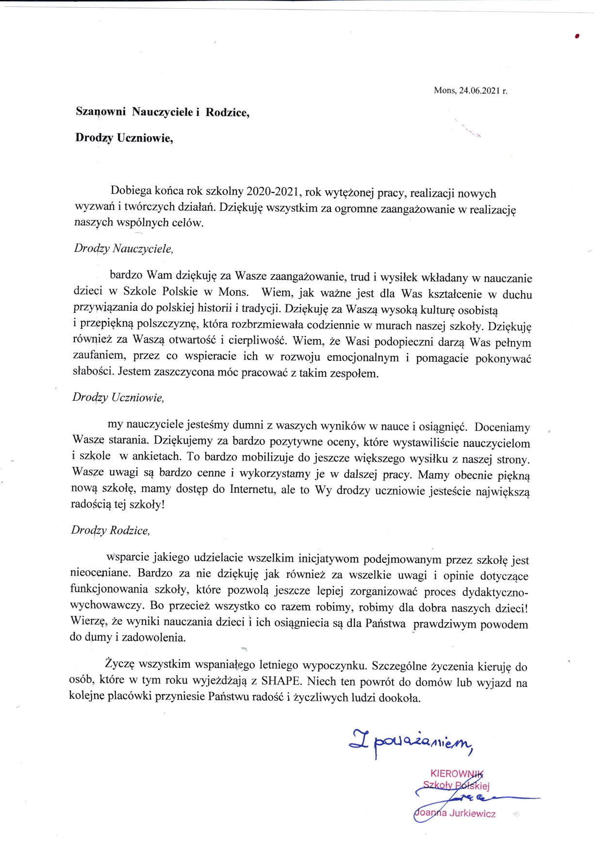 List kierownika szkoły z okazji zakończenia roku szkolnego.