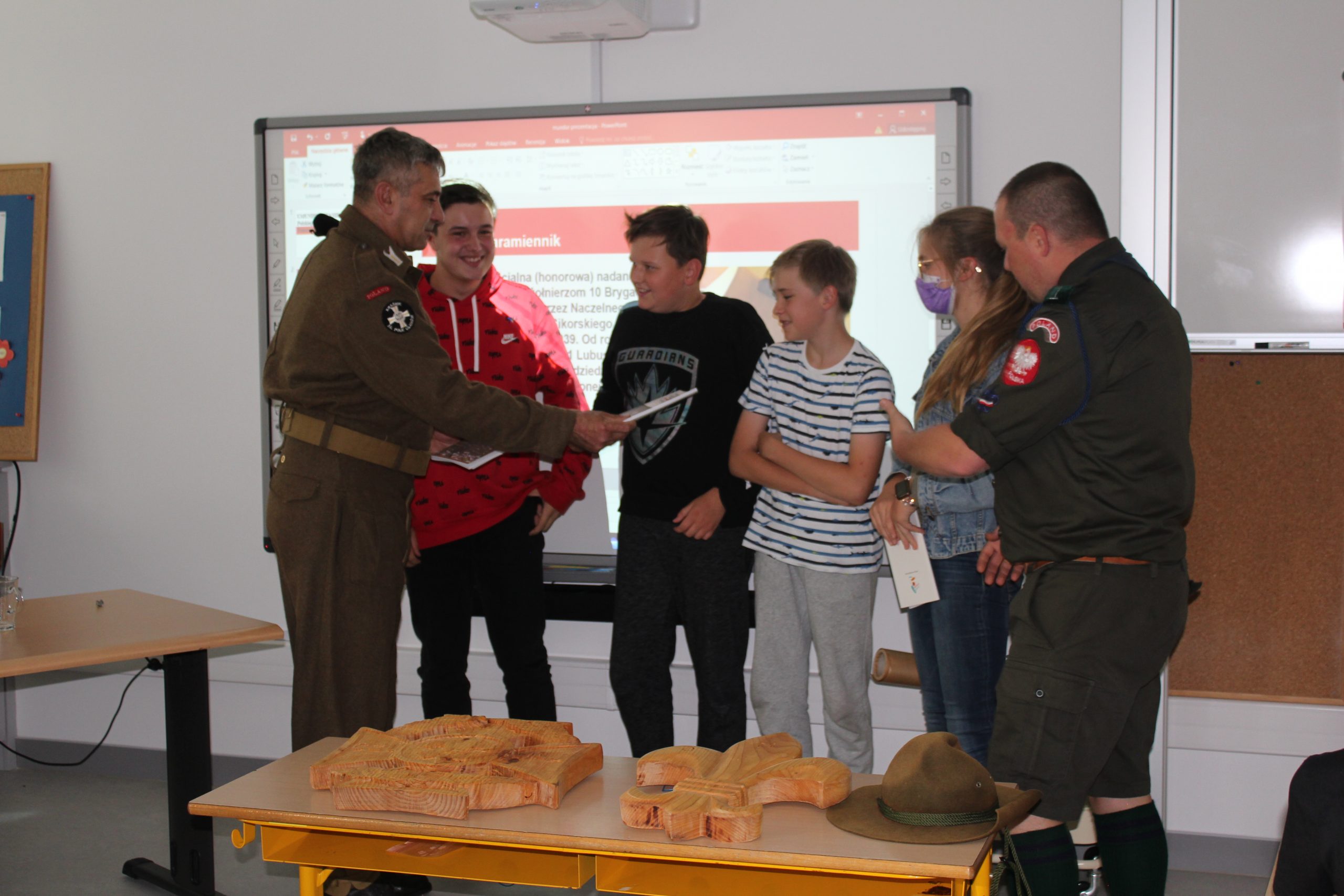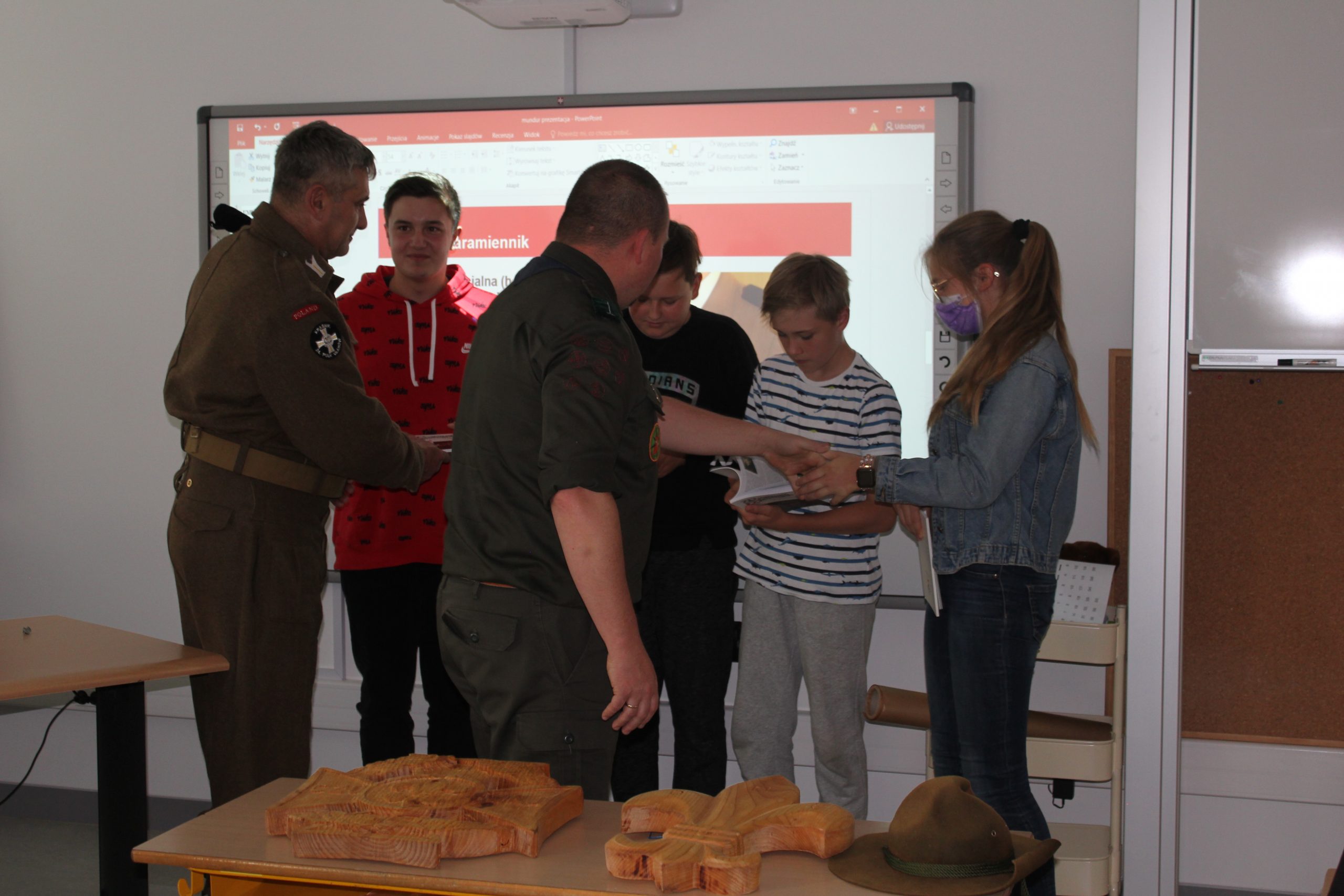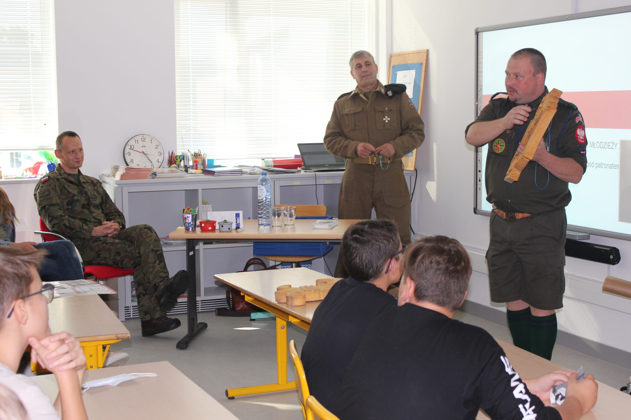 Uczniowie z uwagą słuchali, jak z wielką pasją i zaangażowaniem opowiadali o prawdziwym harcerskim życiu i o harcerskich ideałach: Ojczyźnie, Nauce i Cnocie.