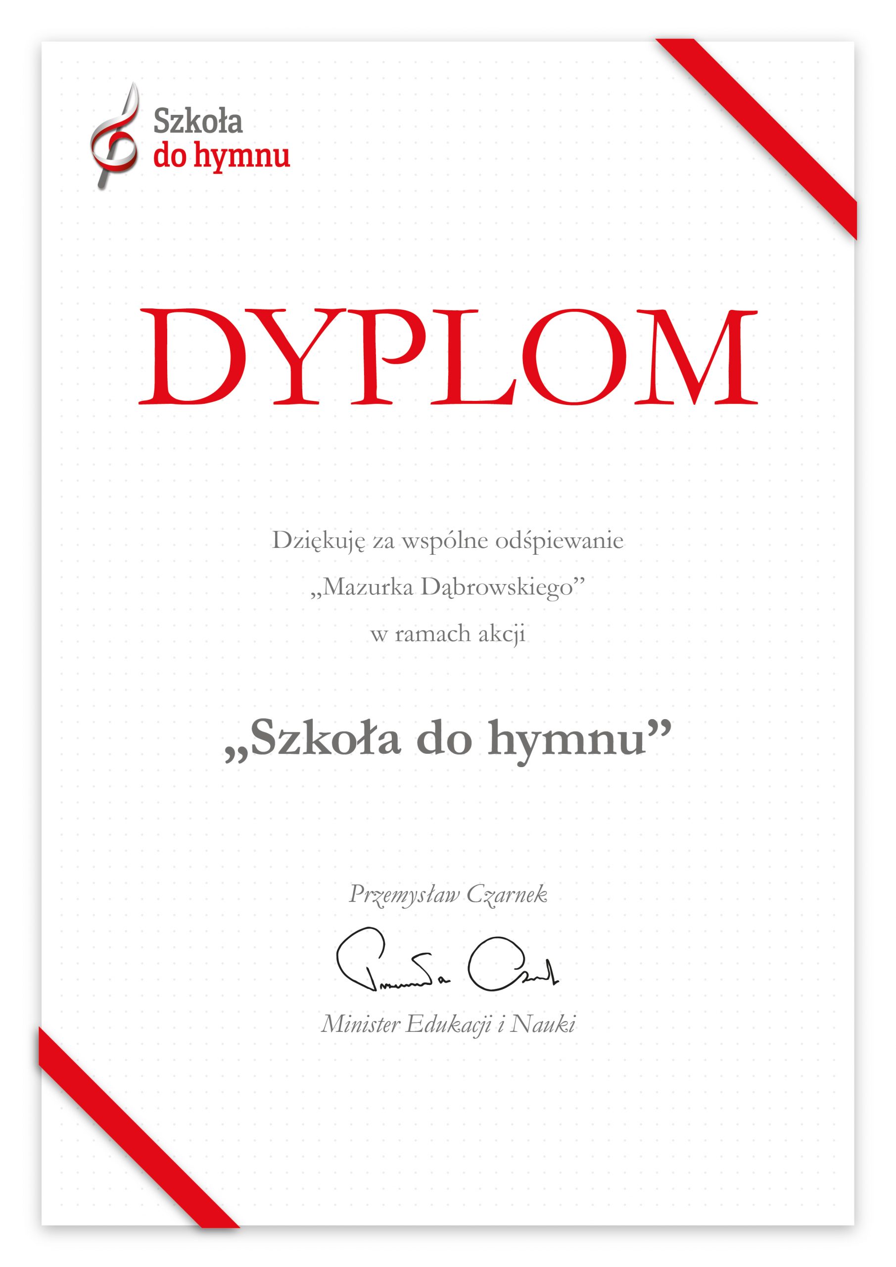 Otrzymaliśmy dyplom Ministra Edukacji i Nauki za udział Szkoły w akcji „Szkoła do hymnu„.