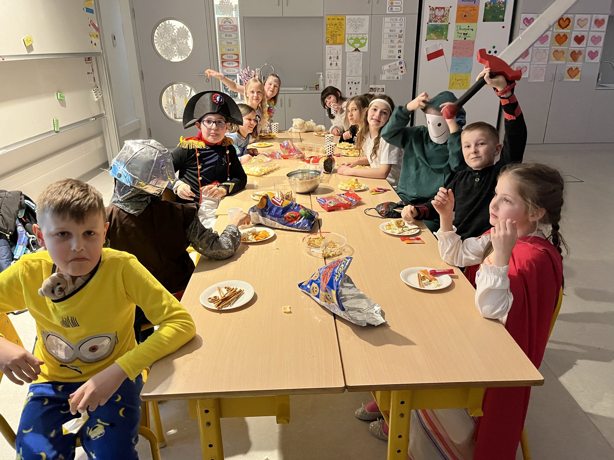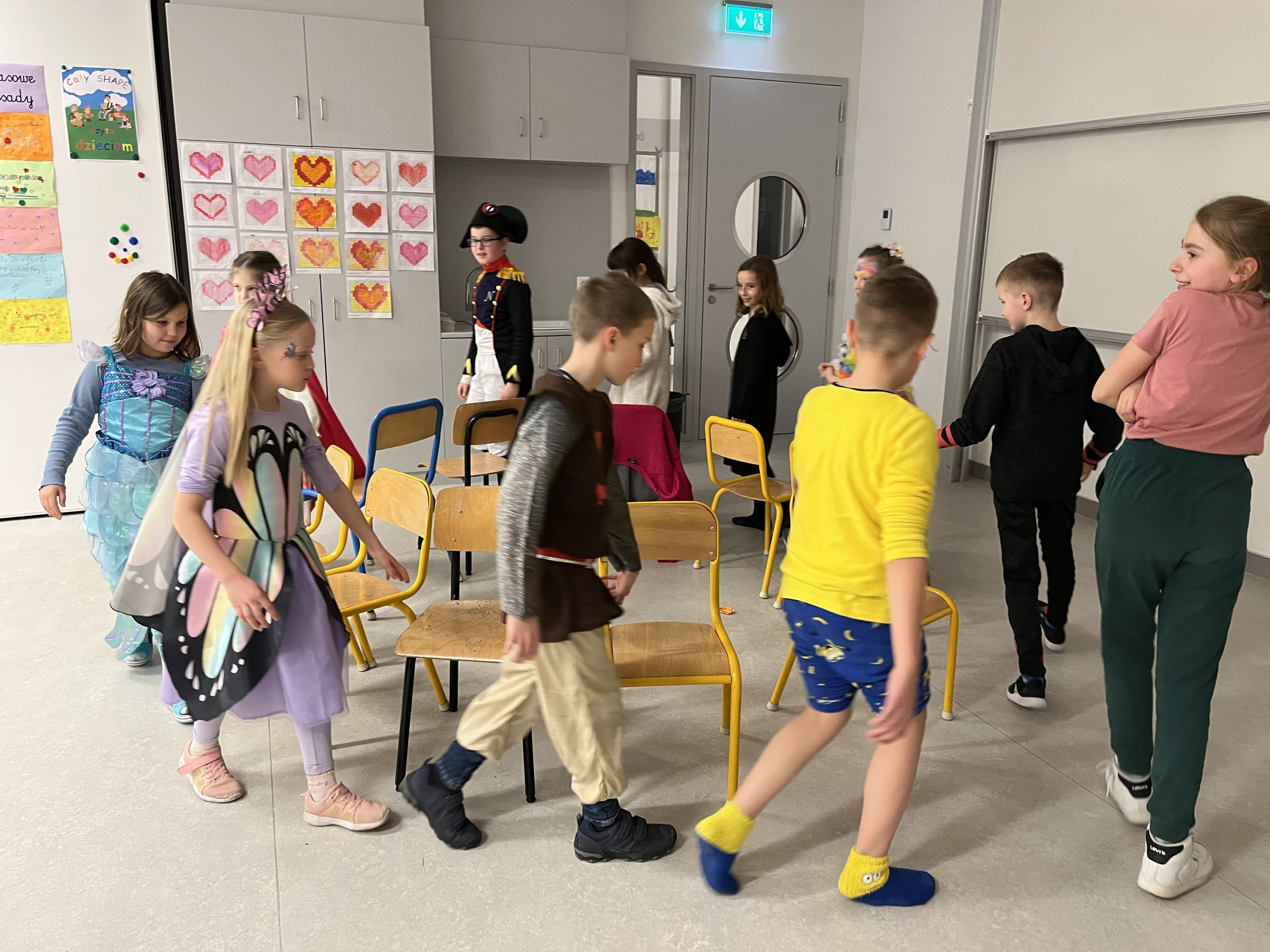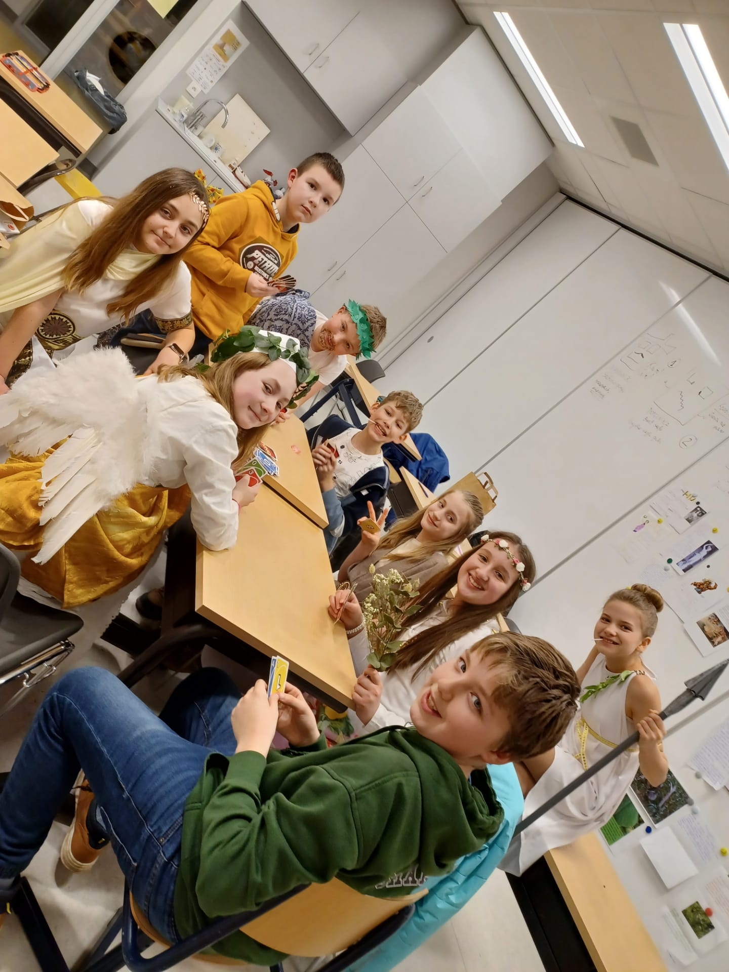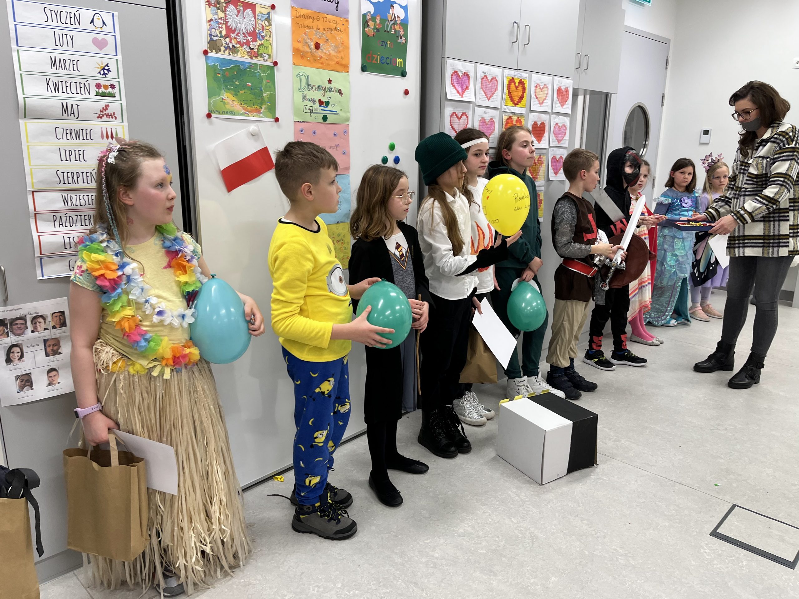 Uczniowie klas 4 i 5 z wielką radością wzięli udział w karnawałowych wyzwaniach. Przebrać się za bohatera literackiego czy filmowego? Dla klasy 4 to pestka! Urządzić karnawał na Olimpie, zaprosić bohaterów mitologicznych na ucztę boskich potraw (na stole królowały Zęby Posejdona, Przysmaki Elizejskie oraz ambrozja z jabłek) i zagrać w karty z bogami? Nie ma rzeczy niemożliwych dla klasy 5! Kunszt przebranych postaci przeszedł nasze najśmielsze oczekiwania. Najstarsi uczniowie również chętnie sięgnęli do epoki starożytnej, by wcielić się w bohaterów „Quo Vadis” inni wybrali Disneya jeszcze inni fantasy: elfy czy krasnale.