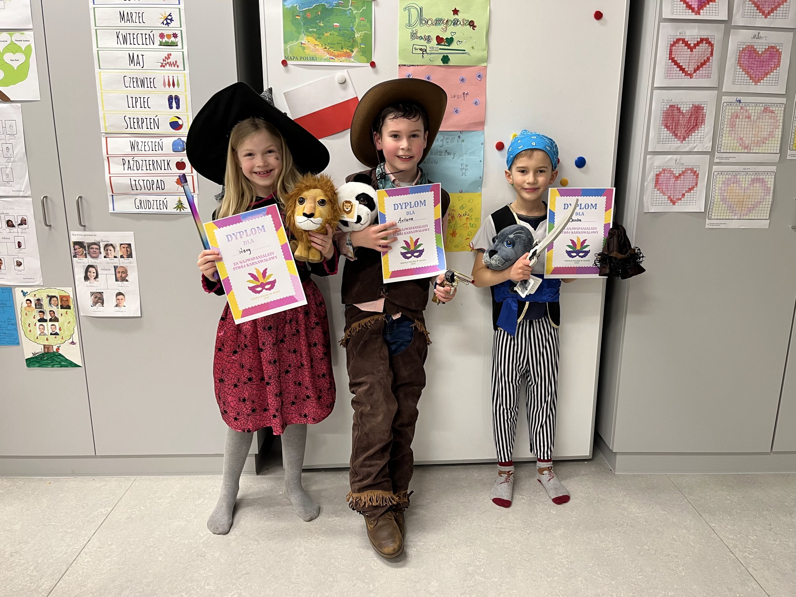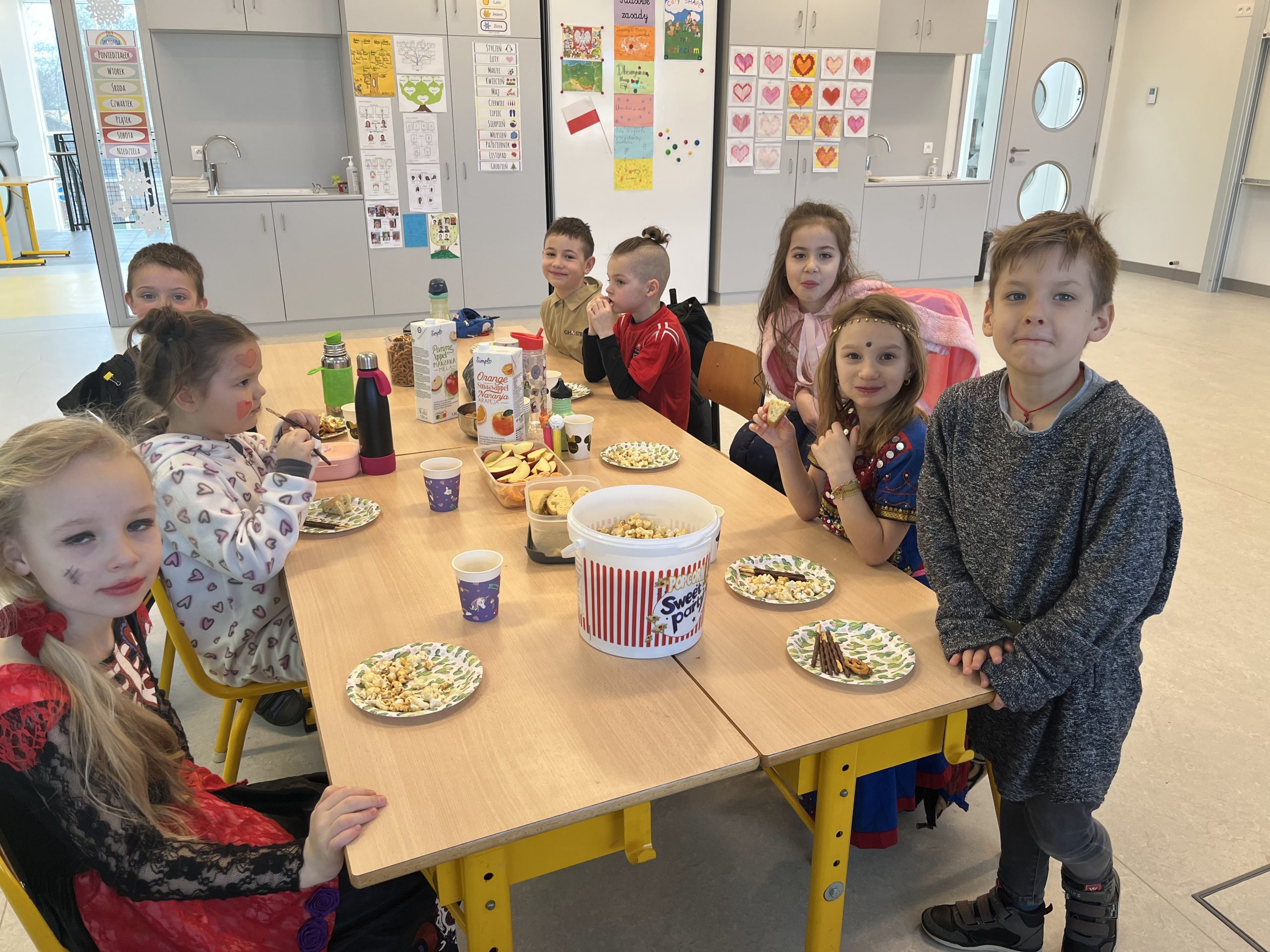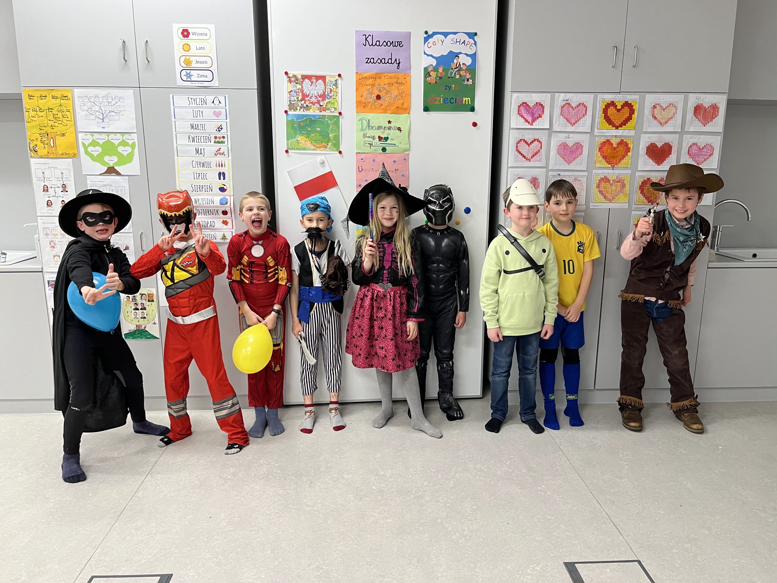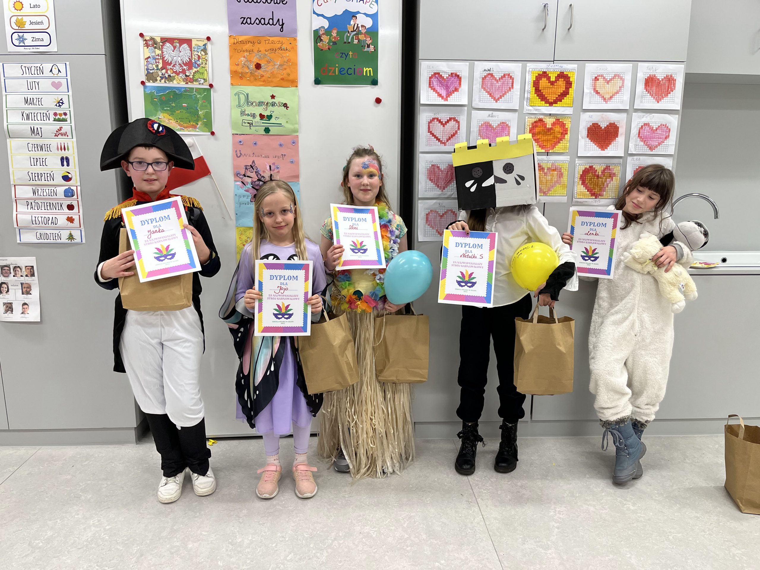 Uczniowie klas 4 i 5 z wielką radością wzięli udział w karnawałowych wyzwaniach. Przebrać się za bohatera literackiego czy filmowego? Dla klasy 4 to pestka! Urządzić karnawał na Olimpie, zaprosić bohaterów mitologicznych na ucztę boskich potraw (na stole królowały Zęby Posejdona, Przysmaki Elizejskie oraz ambrozja z jabłek) i zagrać w karty z bogami? Nie ma rzeczy niemożliwych dla klasy 5! Kunszt przebranych postaci przeszedł nasze najśmielsze oczekiwania. Najstarsi uczniowie również chętnie sięgnęli do epoki starożytnej, by wcielić się w bohaterów „Quo Vadis” inni wybrali Disneya jeszcze inni fantasy: elfy czy krasnale.