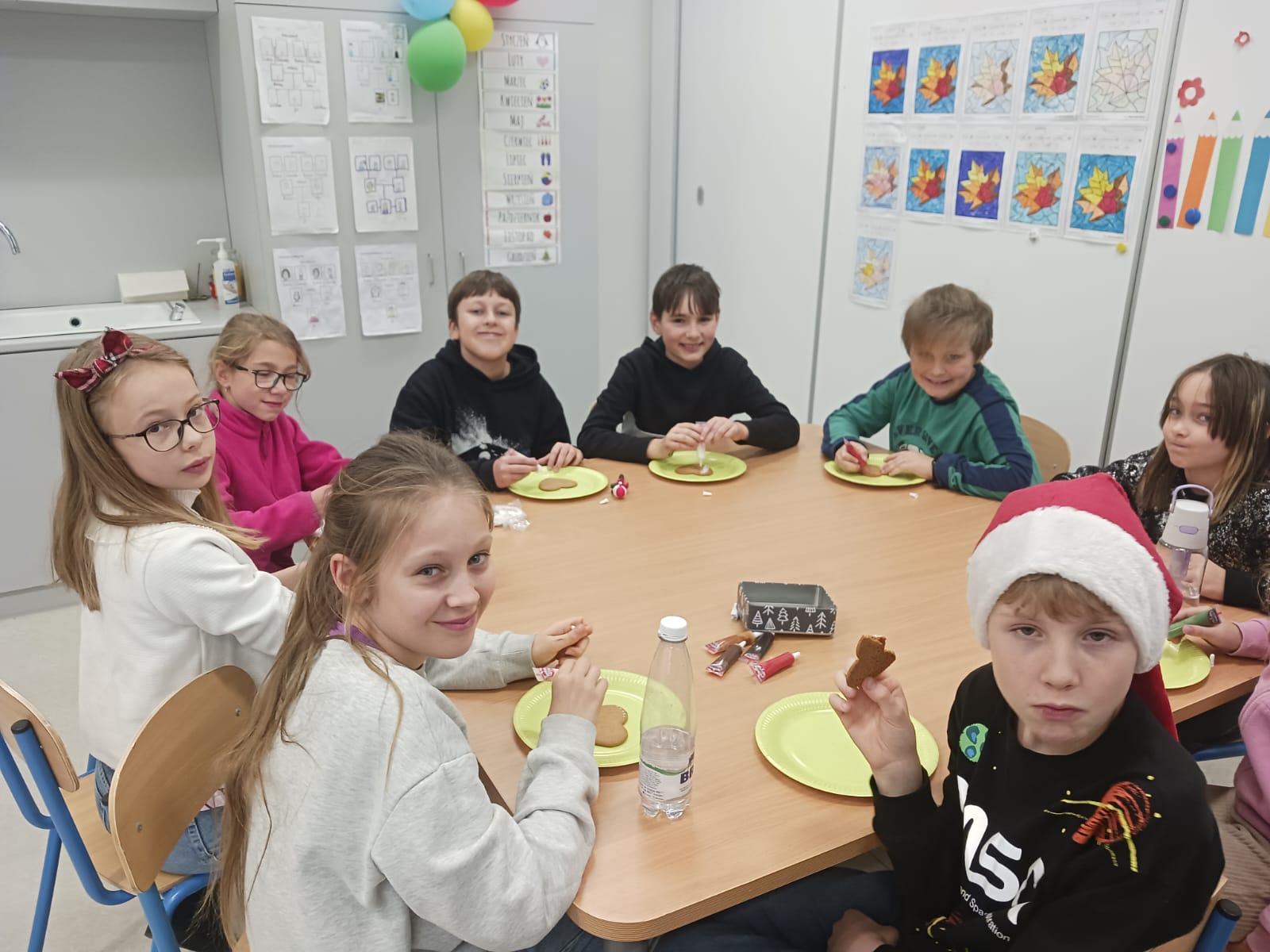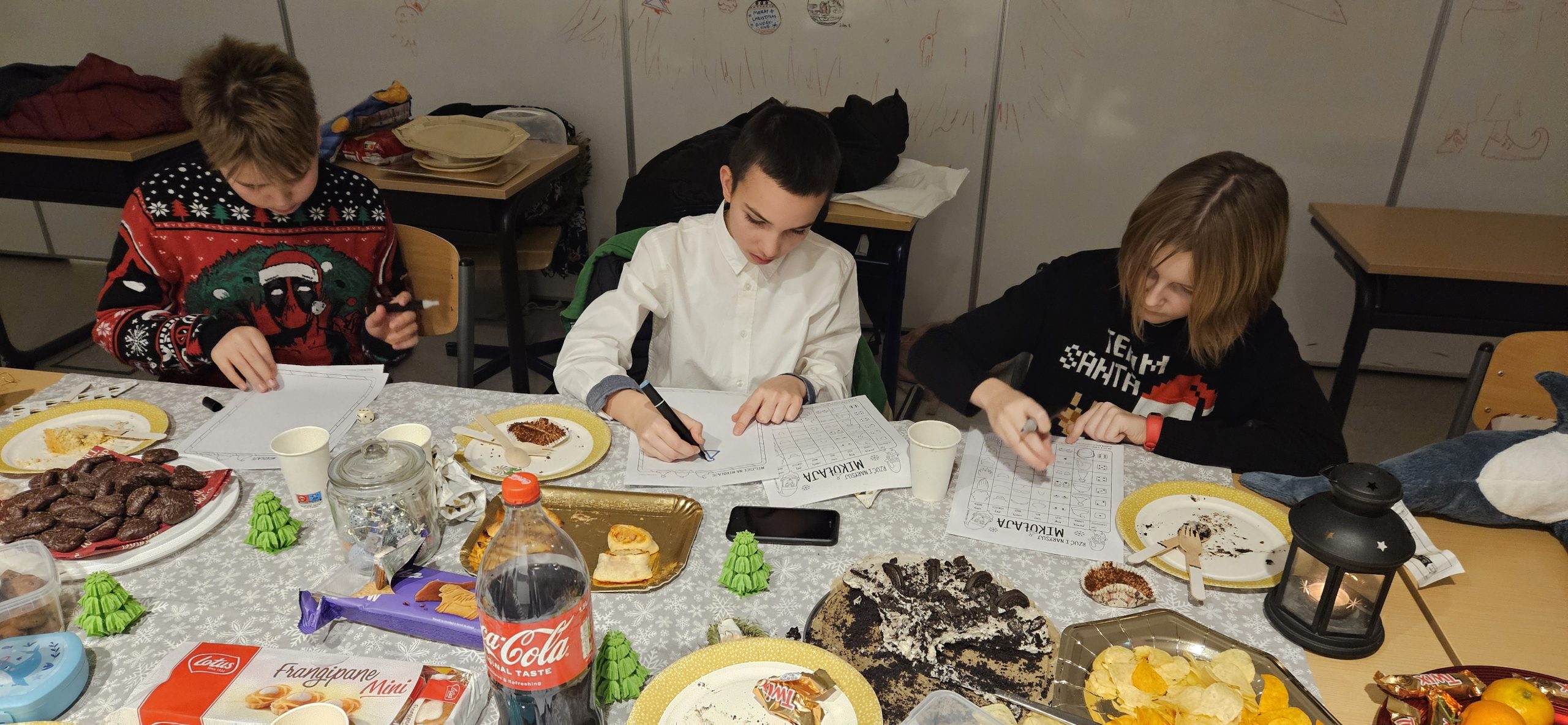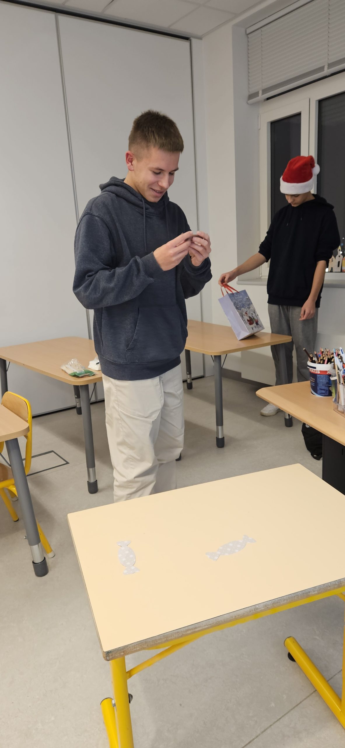 W szkole czuć już atmosferę zbliżających się Świąt. Na korytarzu spotkać można Mikołaja z workiem prezentów. Wszędzie roznosi się zapach wigilijnych potraw, przeplatany z korzenną nutą pierników. Każdy jest uśmiechnięty, słysząc rozbrzmiewające kolędy i pastorałki….