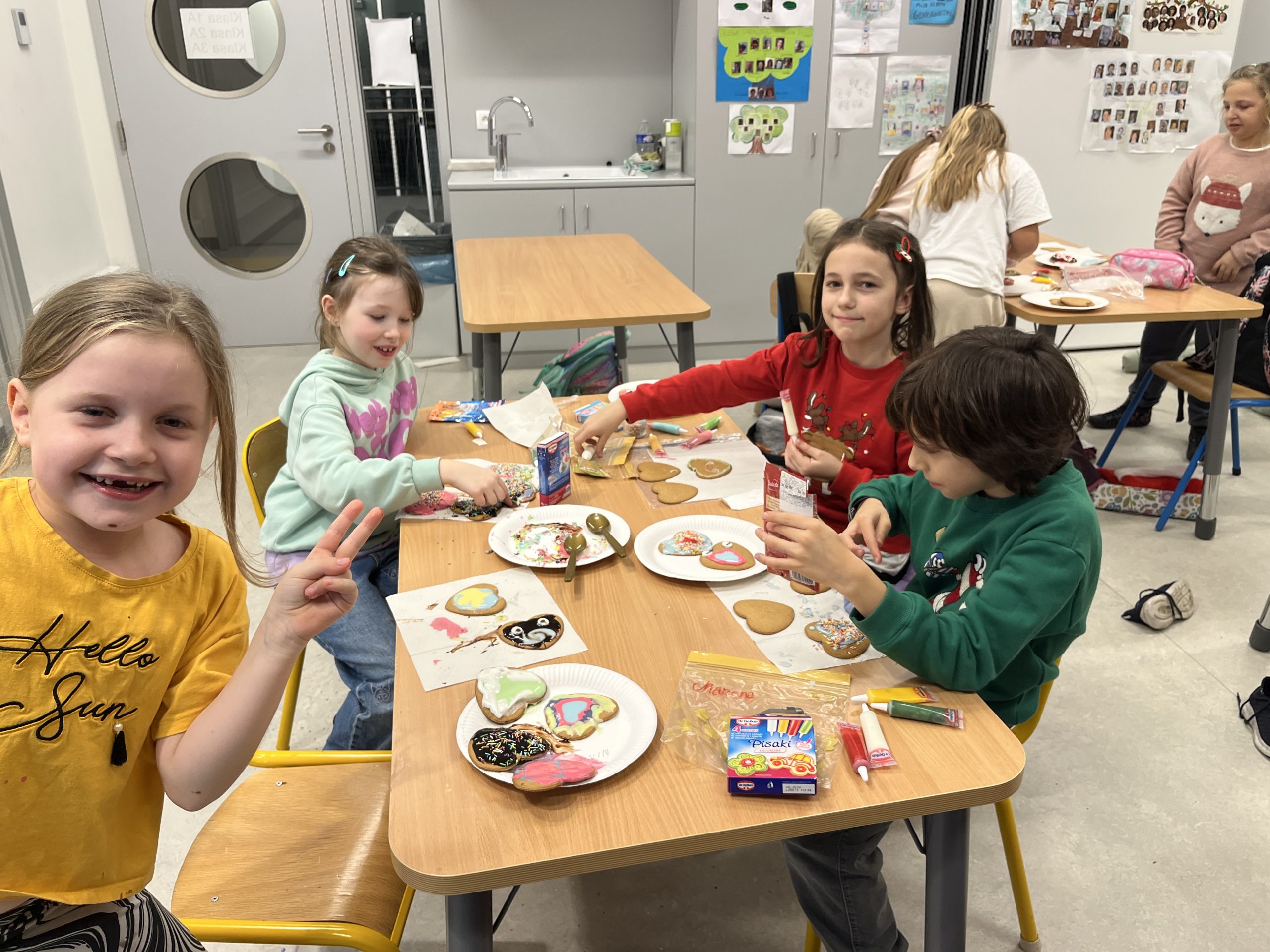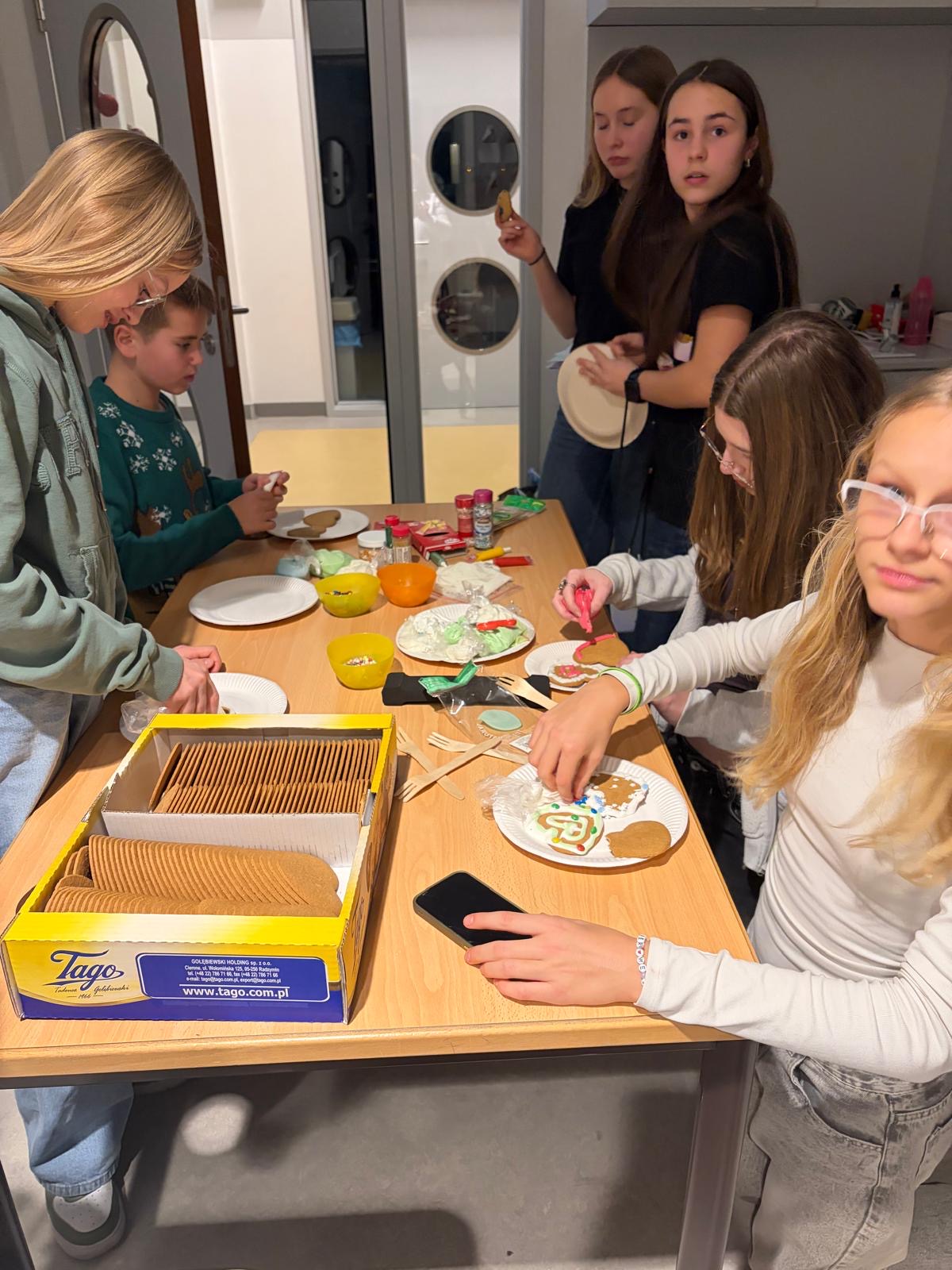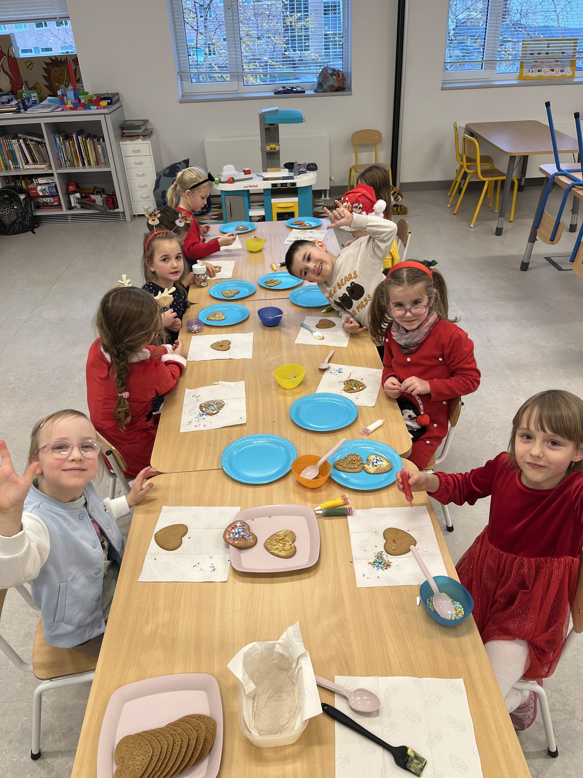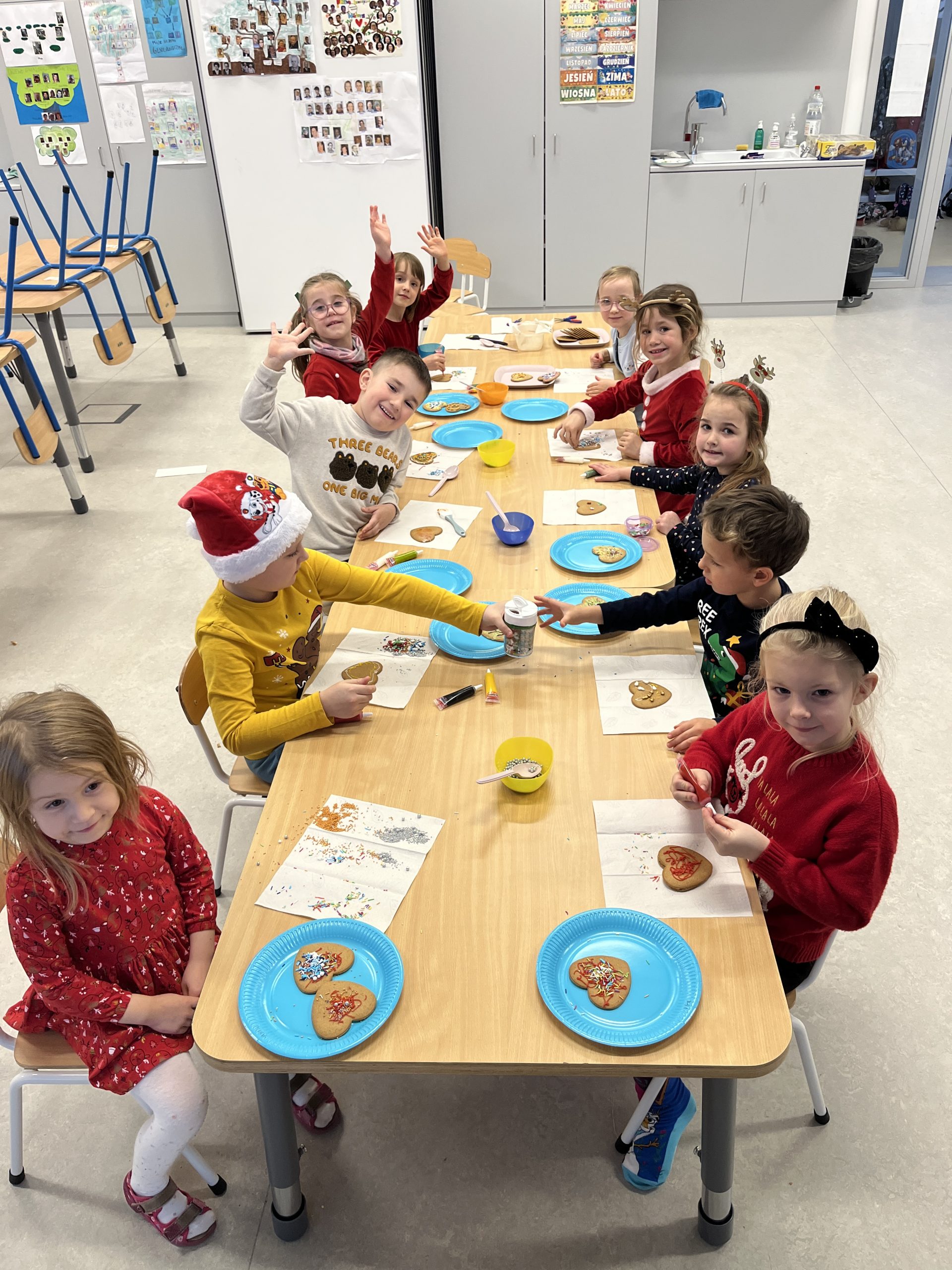 Mikołajki w naszej szkole już na stałe wpisały się w kalendarz ważnych wydarzeń. To przecież znak, że już niedługo będą święta Bożego Narodzenia. Tego dnia atmosfera była niezwykle magiczna i świąteczna, pełna uśmiechu dzieci i nauczycieli. Uczniowie wprowadzili wszystkich obecnych w magiczny nastrój poprzez udekorowanie sal i przygotowanie stołów do poczęstunku, po części ufundowanego przez Radę Rodziców. Punktem centralnym był czas obdarowywania się prezentami. Do młodszych uczniów przyszedł sam święty Mikołaj! A następnie wieczór zakończyły długo oczekiwane warsztaty dekorowania pierników. Każdy uczeń otrzymał zestaw pierników oraz lukier przygotowany i zapakowany starannie przez p.Danusię w woreczki. Ozdabianie pierników przebiegało w atmosferze skupienia i pełnego zaangażowania. Uczniowie wykazali się fantazją i niesamowitym kunsztem.